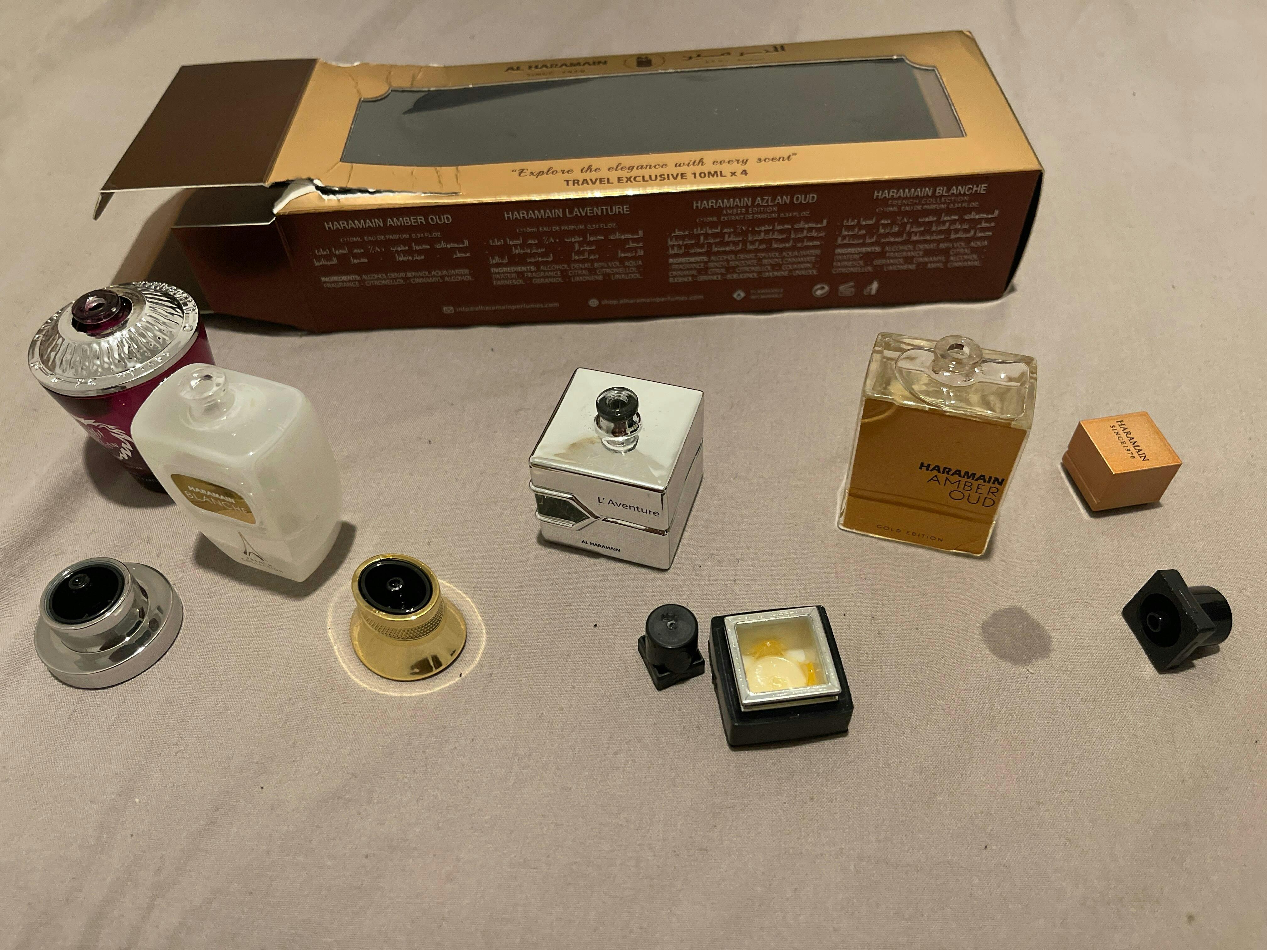 Unit price perExperience luxury on the go with Haramain Travel Exclusive 10ml x 4, a refined collection of four iconic fragrances in miniature form. This exclusive set brings together the radiant sweetness of Amber Oud Gold Edition, the bold and adventurous spirit of L’Aventure, the fresh aquatic scent of Azlan Bleu, and the captivating warmth of Haramain Rouge French Collection. Each scent is a masterpiece, crafted to complement every occasion, whether you're exploring new destinations or indulging in timeless sophistication. With this travel-friendly selection, elegance is always within reach.